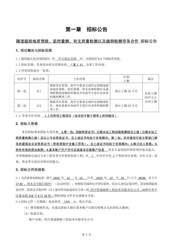 隧道超前地質(zhì)預(yù)報、監(jiān)控量測、初支質(zhì)量檢測以及涵洞檢測勞務(wù)合作招標公告