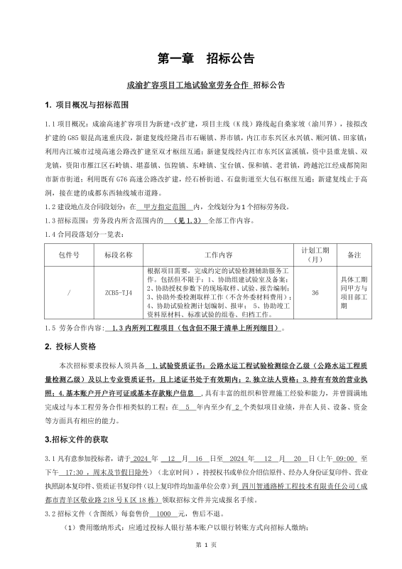 成渝擴(kuò)容項(xiàng)目工地試驗(yàn)室勞務(wù)合作招標(biāo)公告